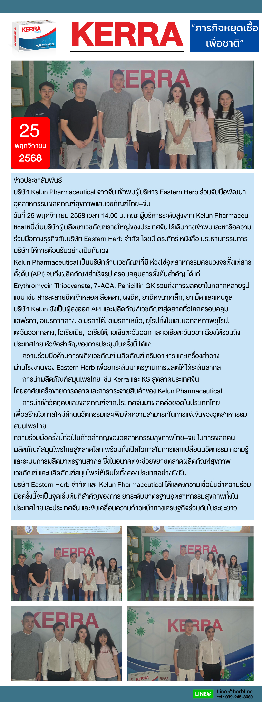 วันที่ 25 พฤศจิกายน 2568 เวลา 14.00 น. คณะผู้บริหารระดับสูงจาก Kelun Pharmaceutical หนึ่งในบริษัทผู้ผลิตยาเวชภัณฑ์รายใหญ่ของประเทศจีน ได้เดินทางเข้าพบและหารือความร่วมมือทางธุรกิจกับบริษัท Eastern Herb จำกัด โดยมี ดร.ภัทร์ หนังสือ ประธานกรรมการบริษัท ให้การต้อนรับอย่างเป็นกันเอง